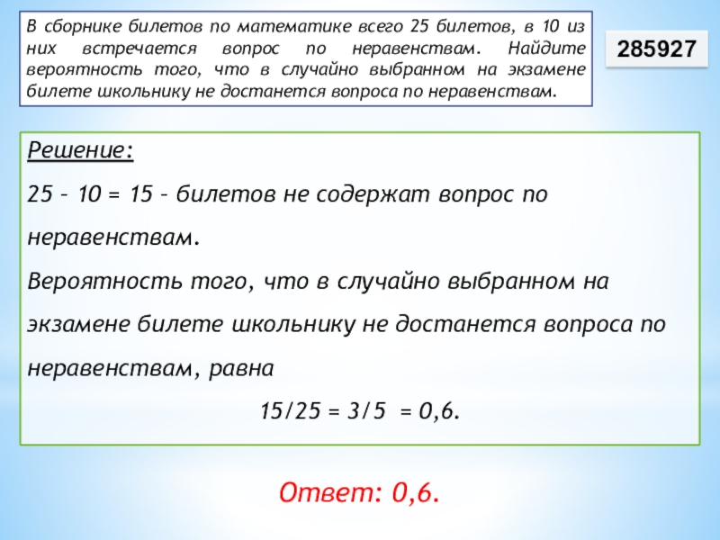 25 – 10 = 15 – билетов не содержат вопрос по неравенствам.