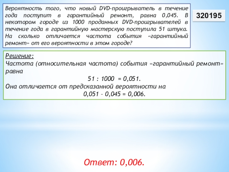 Вероятность того, что новый DVD-проигрыватель в течение года поступит в гарантийный ремонт, равна 0,045. В некотором городе из 1000 проданных DVD-проигрывателей в течение года в гарантийную мастерскую поступила 51 штука. На сколько отличается частота события «гарантийный ремонт» от его вероятности в этом городе?
