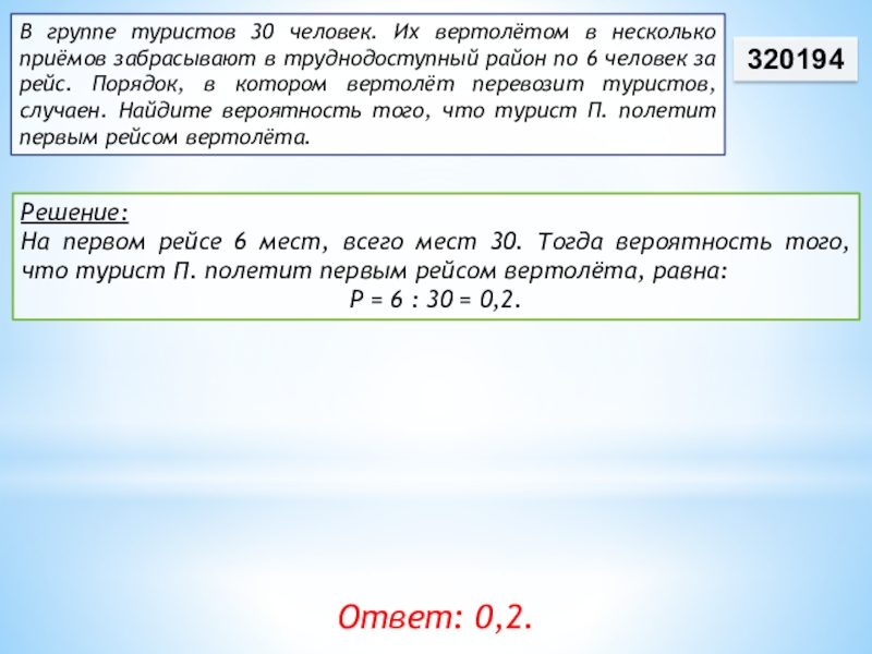 В группе туристов 30 человек. Их вертолётом в несколько приёмов забрасывают в труднодоступный район по 6 человек за рейс. Порядок, в котором вертолёт перевозит туристов, случаен. Найдите вероятность того, что турист П. полетит первым рейсом вертолёта.