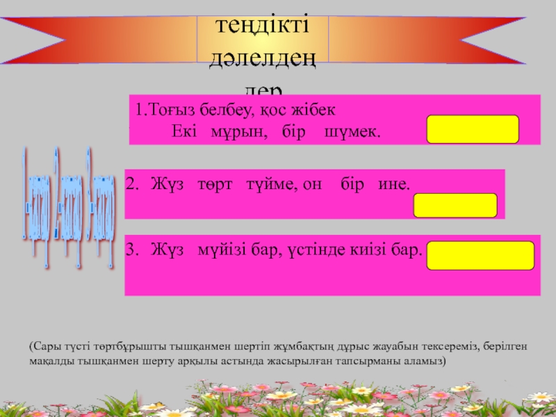 (Сары түсті төртбұрышты тышқанмен шертіп жұмбақтың дұрыс жауабын тексереміз, берілген
