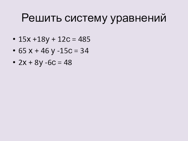 Решить систему уравнений15х +18у + 12с = 48565 х + 46 у -15с = 342х + 8у -6с = 48