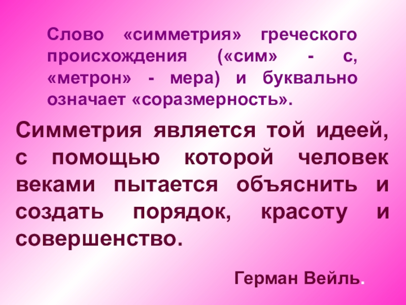 Симметрия является той идеей, с помощью которой человек веками пытается объяснить и создать порядок, красоту и совершенство.
