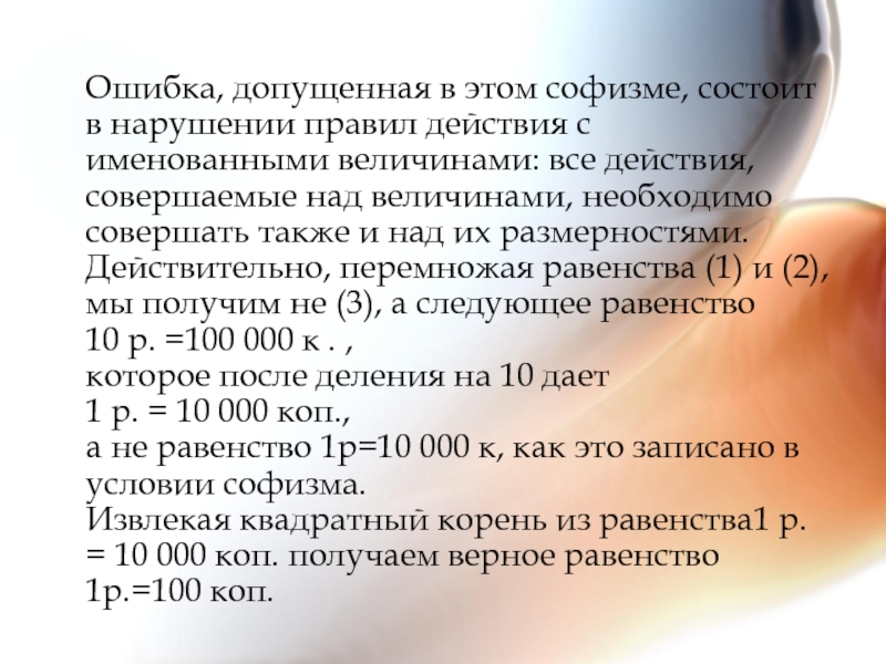 а не равенство 1р=10 000 к, как это записано в условии софизма.