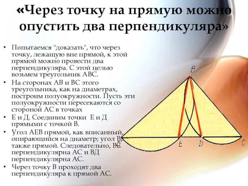 Слайд 13«Через точку на прямую можно опустить два перпендикуляра»