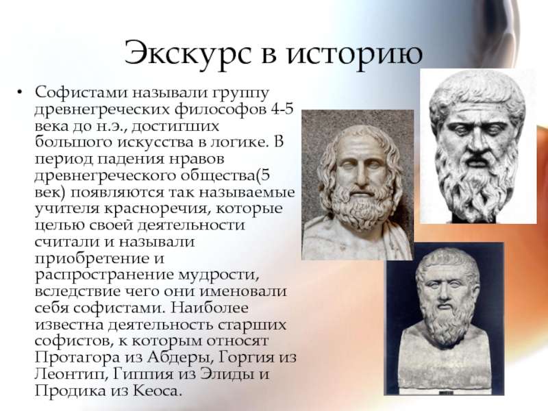 достигших большого искусства в логике. В период падения нравов древнегреческого общества(5 век) появляются так называемые учителя красноречия, которые целью своей деятельности считали и называли приобретение и распространение мудрости, вследствие чего они именовали себя софистами. Наиболее известна деятельность старших софистов, к которым относят Протагора из Абдеры, Горгия из Леонтип, Гиппия из Элиды и Продика из Кеоса.