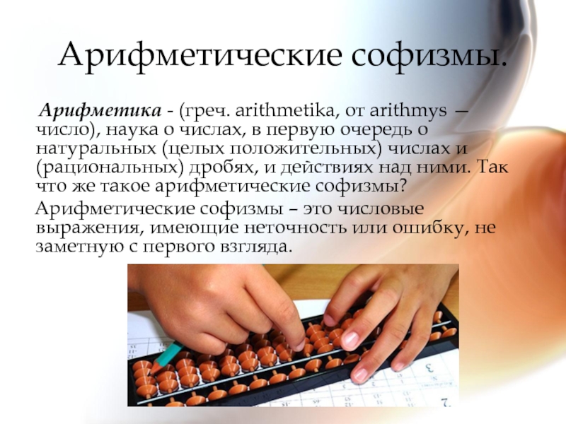 число), наука о числах, в первую очередь о натуральных (целых положительных) числах и (рациональных) дробях, и действиях над ними. Так что же такое арифметические софизмы?