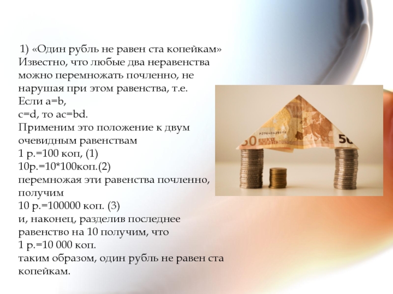 Извлекая квадратный корень из равенства1 р. = 10 000 коп. получаем верное равенство 1р.=100 коп.