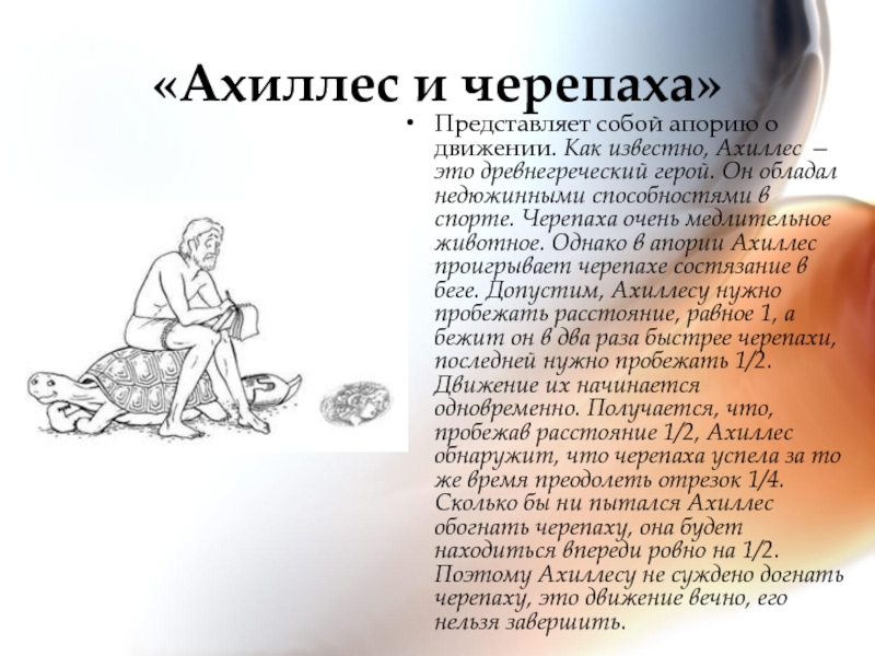 древнегреческий герой. Он обладал недюжинными способностями в спорте. Черепаха очень медлительное животное. Однако в апории Ахиллес проигрывает черепахе состязание в беге. Допустим, Ахиллесу нужно пробежать расстояние, равное 1, а бежит он в два раза быстрее черепахи, последней нужно пробежать 1/2. Движение их начинается одновременно. Получается, что, пробежав расстояние 1/2, Ахиллес обнаружит, что черепаха успела за то же время преодолеть отрезок 1/4. Сколько бы ни пытался Ахиллес обогнать черепаху, она будет находиться впереди ровно на 1/2. Поэтому Ахиллесу не суждено догнать черепаху, это движение вечно, его нельзя завершить.