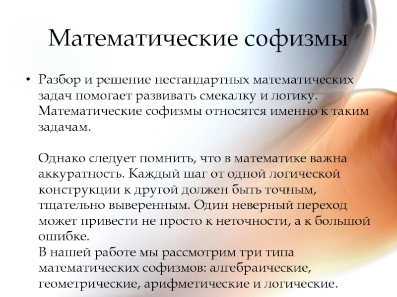 В нашей работе мы рассмотрим три типа математических софизмов: алгебраические, геометрические, арифметические и логические.