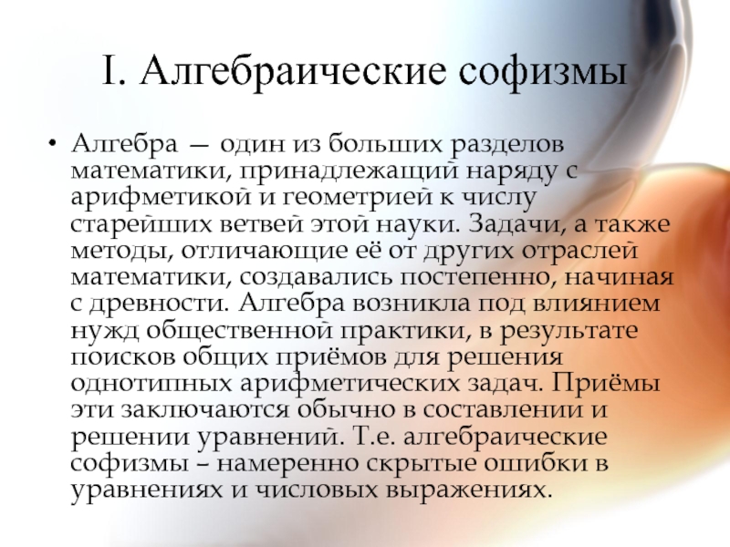 с арифметикой и геометрией к числу старейших ветвей этой науки. Задачи, а также методы, отличающие её от других отраслей математики, создавались постепенно, начиная с древности. Алгебра возникла под влиянием нужд общественной практики, в результате поисков общих приёмов для решения однотипных арифметических задач. Приёмы эти заключаются обычно в составлении и решении уравнений. Т.е. алгебраические софизмы – намеренно скрытые ошибки в уравнениях и числовых выражениях.