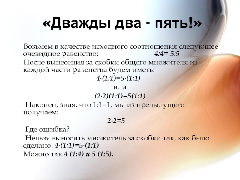 Арифметические софизмы – это числовые выражения, имеющие неточность или ошибку, не заметную с первого взгляда.