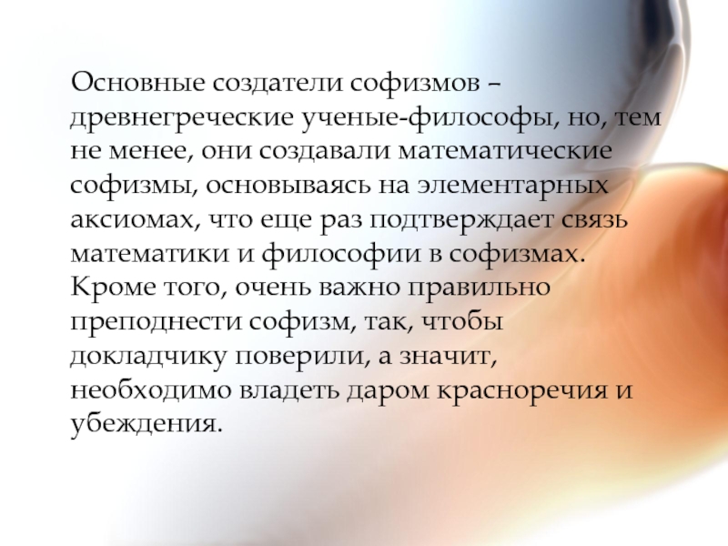 Кроме того, очень важно правильно преподнести софизм, так, чтобы докладчику поверили, а значит, необходимо владеть даром красноречия и убеждения.