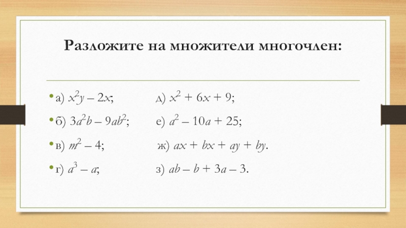 Разложите на множители многочлен: а) х2у – 2х;			 д) х2 + 6х + 9;б) 3a2b – 9ab2;