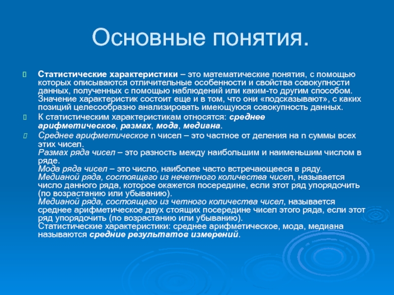 Статистические характеристики – это математические понятия, с помощью которых описываются отличительные