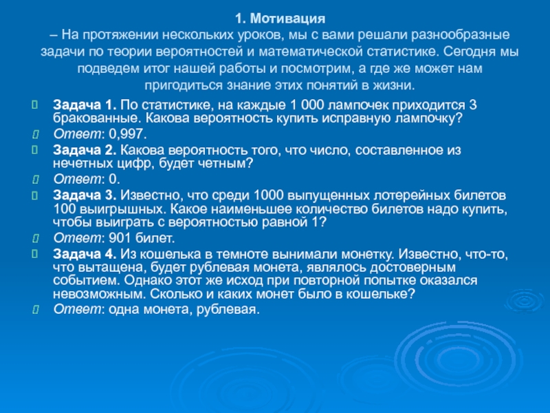 задачи по теории вероятностей и математической статистике. Сегодня мы подведем итог нашей работы и посмотрим, а где же может нам пригодиться знание этих понятий в жизни.