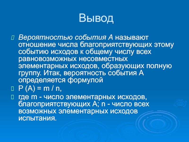 Вероятностью события А называют отношение числа благоприятствующих этому событию исходов к общему