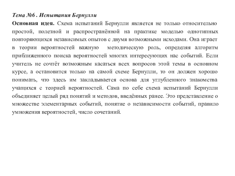 только относительно простой, полезной и распространённой на практике моделью однотипных повторяющихся независимых опытов с двумя возможными исходами. Она играет в теории вероятностей важную методическую роль, определяя алгоритм приближенного поиска вероятностей многих интересующих нас событий. Если учитель не сочтёт возможным касаться всех вопросов этой темы в основном курсе, а остановится только на самой схеме Бернулли, то он должен хорошо понимать, что здесь им закладывается основа для углубленного знакомства учащихся с теорией вероятностей. Сама по себе схема испытаний Бернулли объединяет целый ряд понятий и методов, введённых ранее. Это представление о множестве элементарных событий, понятие о независимости событий, правило умножения вероятностей, число сочетаний.