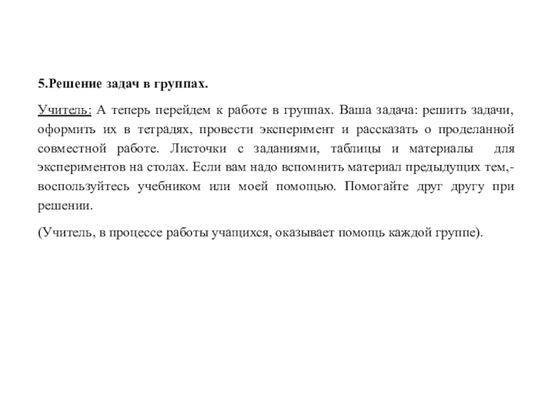 в группах. Ваша задача: решить задачи, оформить их в тетрадях, провести эксперимент и рассказать о проделанной совместной работе. Листочки с заданиями, таблицы и материалы для экспериментов на столах. Если вам надо вспомнить материал предыдущих тем,- воспользуйтесь учебником или моей помощью. Помогайте друг другу при решении.
