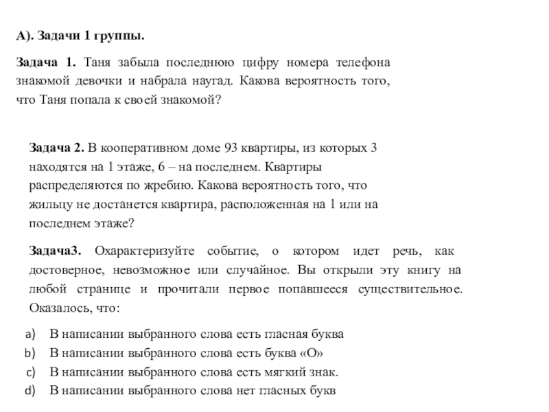 Задача3. Охарактеризуйте событие, о котором идет речь, как достоверное, невозможное или случайное. Вы открыли эту книгу на любой странице и прочитали первое попавшееся существительное. Оказалось, что: