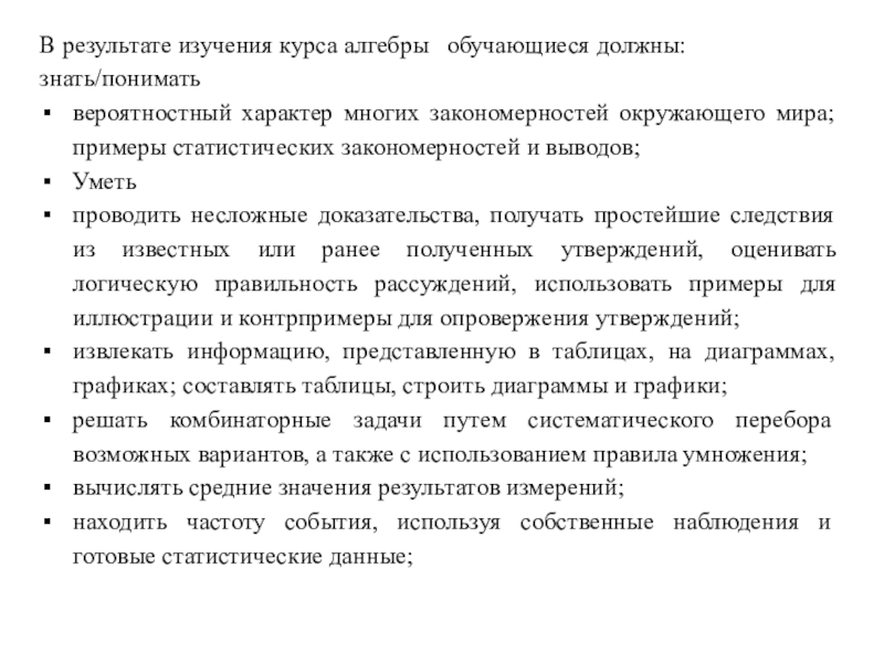 Слайд 2В результате изучения курса алгебры обучающиеся должны: