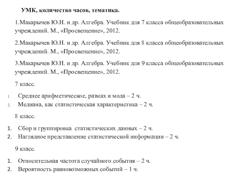 3.Макарычев Ю.Н. и др. Алгебра. Учебник для 9 класса общеобразовательных учреждений. М., «Просвещение», 2012.