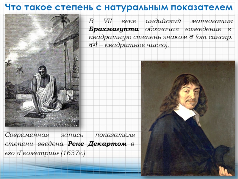 В VII веке индийский математик Брахмагупта обозначал возведение в квадратную степень знаком व (от санскр. वर्ग – квадратное число).