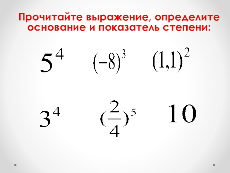 Слайд 4Прочитайте выражение, определите основание и показатель степени:
