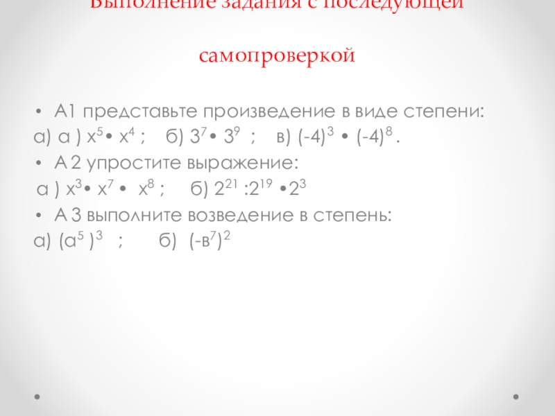 Выполнение задания с последующей самопроверкойА1 представьте произведение в виде степени:а) а ) х5• х4 ;  б)