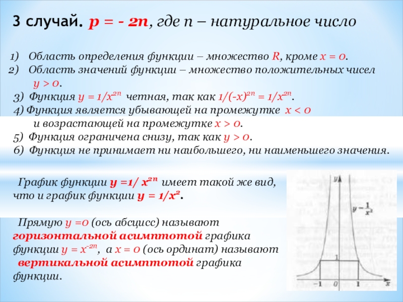 Прямую y =0 (ось абсцисс) называют горизонтальной асимптотой графика функции y = x-2n, а x = 0 (ось ординат) называют