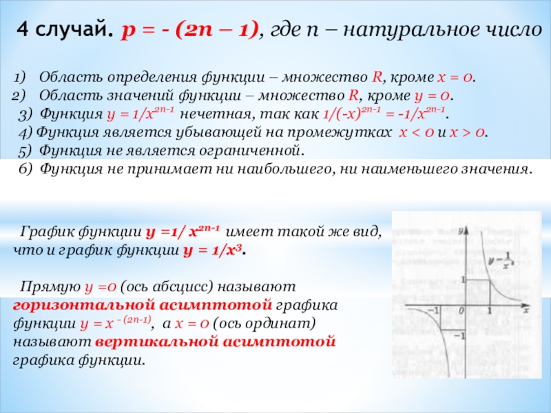 3) Функция y = 1/x2n-1 нечетная, так как 1/(-x)2n-1 = -1/x2n-1.