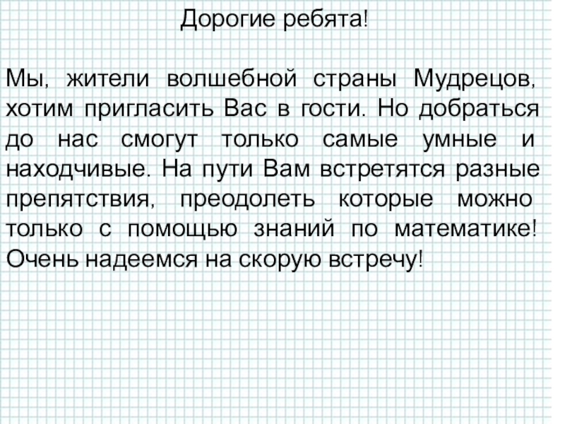 Мы, жители волшебной страны Мудрецов, хотим пригласить Вас в гости. Но добраться до нас смогут только самые умные и находчивые. На пути Вам встретятся разные препятствия, преодолеть которые можно только с помощью знаний по математике! Очень надеемся на скорую встречу!