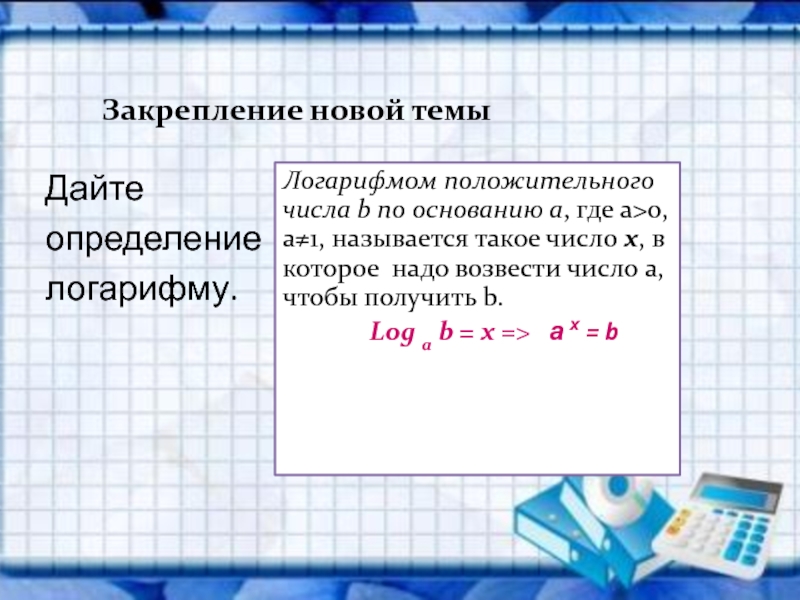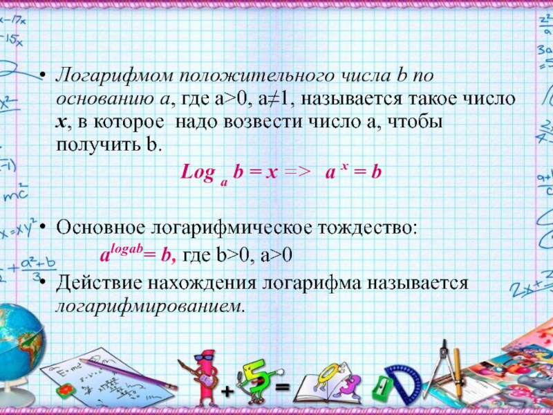 Слайд 8Логарифмом положительного числа b по основанию a, где a>0, a≠1, называется
