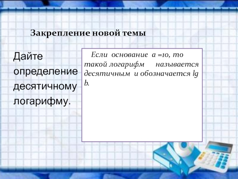 Слайд 11Понятие десятичных и натуральных логарифмов.
