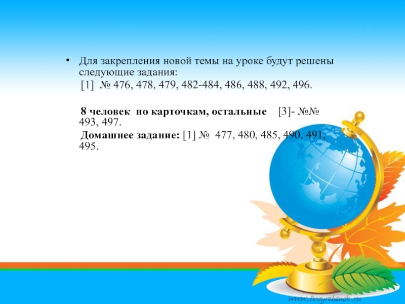Домашнее задание: [1] № 477, 480, 485, 490, 491, 495.