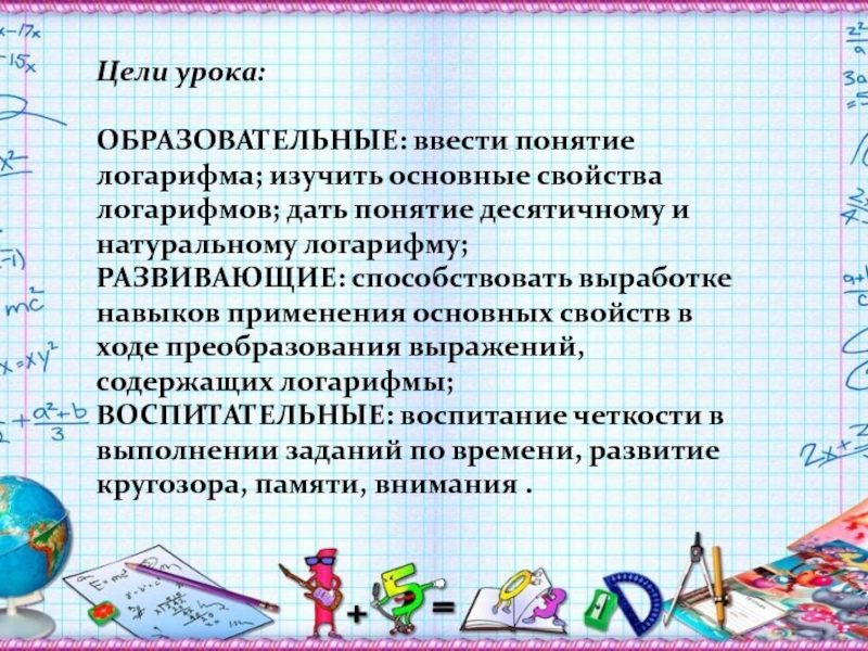 РАЗВИВАЮЩИЕ: способствовать выработке навыков применения основных свойств в ходе преобразования выражений, содержащих логарифмы;