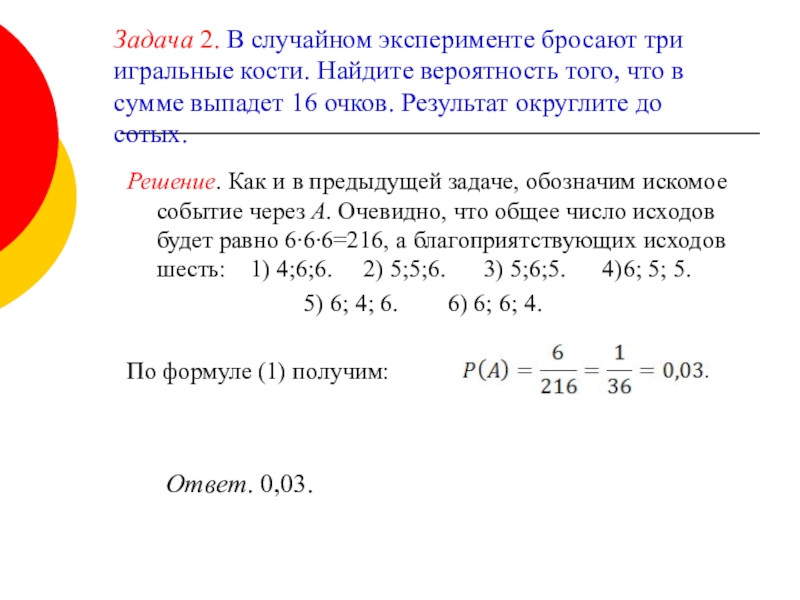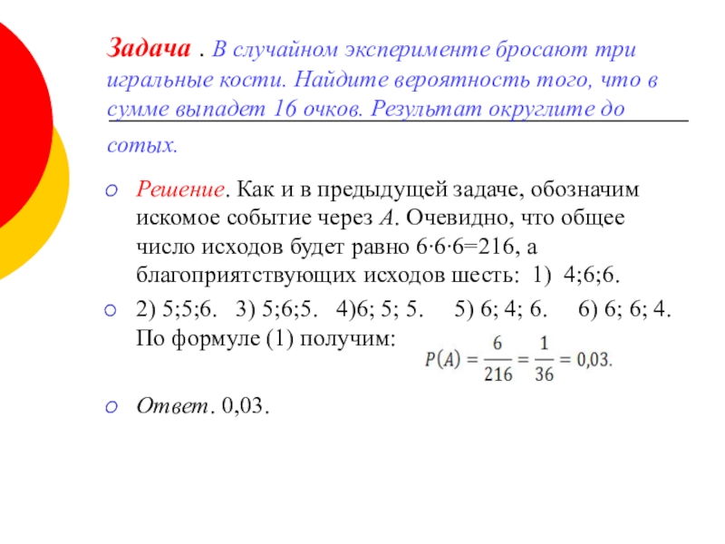 Решение. Как и в предыдущей задаче, обозначим искомое событие через А. Очевидно, что общее число исходов будет равно 6∙6∙6=216, а благоприятствующих исходов шесть: 1) 4;6;6.
