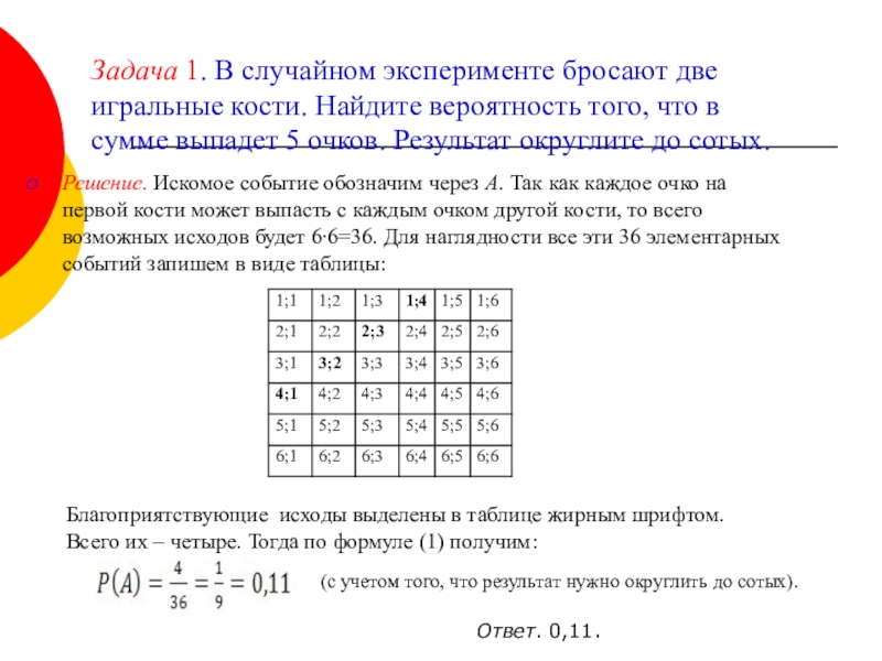 Решение. Искомое событие обозначим через А. Так как каждое очко на первой кости может выпасть с каждым очком другой кости, то всего возможных исходов будет 6∙6=36. Для наглядности все эти 36 элементарных событий запишем в виде таблицы: