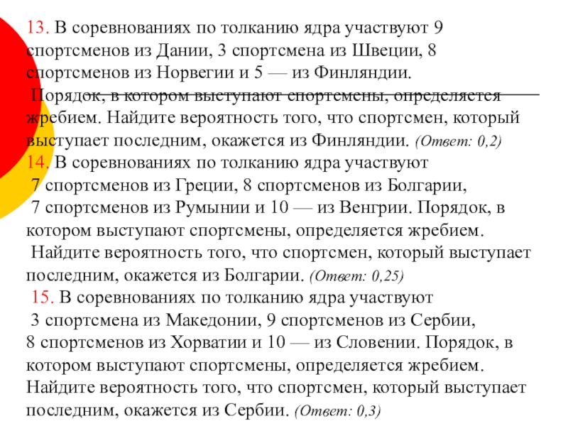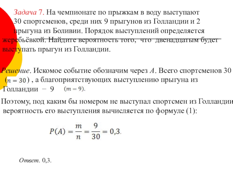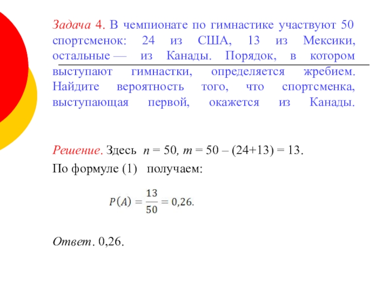 Решение. В третий день выступают 10 спортсменок и среди них одна Россиянка. Значит, благоприятствующих исходов − 10, а всего исходов – 40. Тогда по формуле (1) получим: