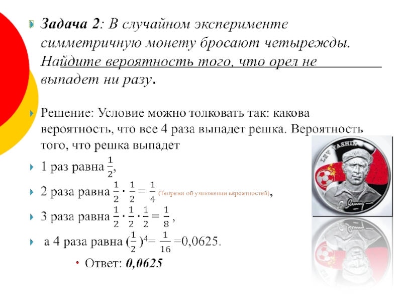 Решение. При одном подбрасывании симметричной монеты выпадет орел (событие О) или решка (событие Р). При двух подбрасываниях монеты число случаев удвоится (в предыдущих двух случаях впереди появится О или Р): ОО, ОР, РО, РР. То же происходит и при подбрасывании монеты три раза, т.е. всевозможных исходов восемь: ООО, ООР, ОРО, ОРР, РОО, РОР, РРО, РРР. Если монету подбрасывают четырежды, то число возможных исходов 16: ОООО , ОООР, ,,,, РРРР. При этом орел не выпадет ни разу только в одном случае (РРРР). Снова обозначая интересующее нас событие через А, по формуле (1) получим: