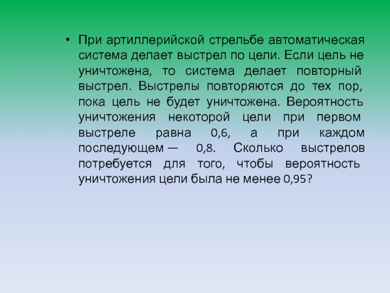 не уничтожена, то система делает повторный выстрел. Выстрелы повторяются до тех пор, пока цель не будет уничтожена. Вероятность уничтожения некоторой цели при первом выстреле равна 0,6, а при каждом последующем — 0,8. Сколько выстрелов потребуется для того, чтобы вероятность уничтожения цели была не менее 0,95?