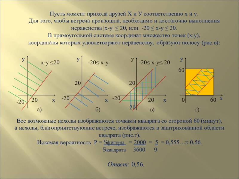 того, чтобы встреча произошла, необходимо и достаточно выполнения неравенства |х-у| ≤ 20, или -20 ≤ х-у ≤ 20.