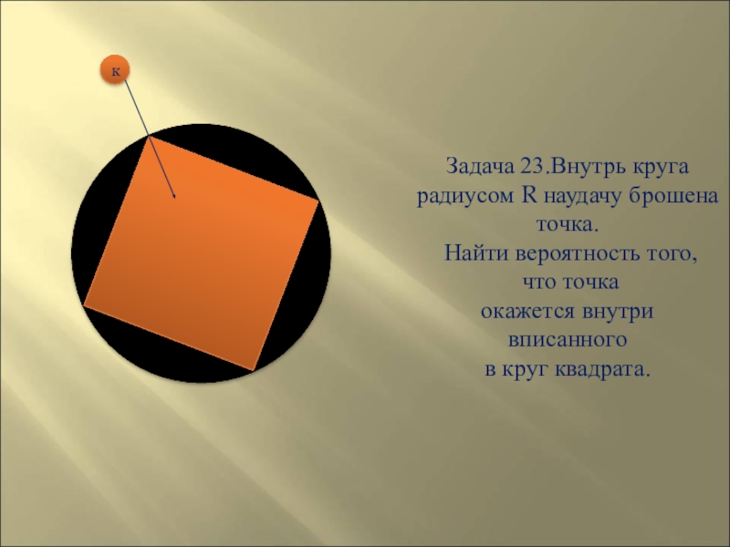 Слайд 8Задача 23.Внутрь круга радиусом R наудачу брошена точка.
