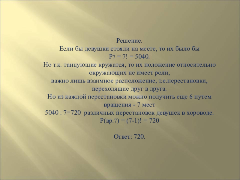 5040 : 7=720 различных перестановок девушек в хороводе.
