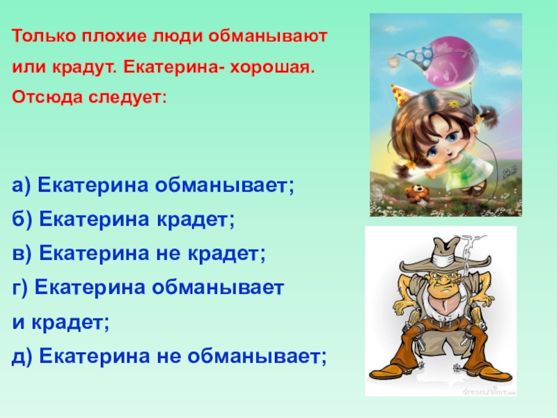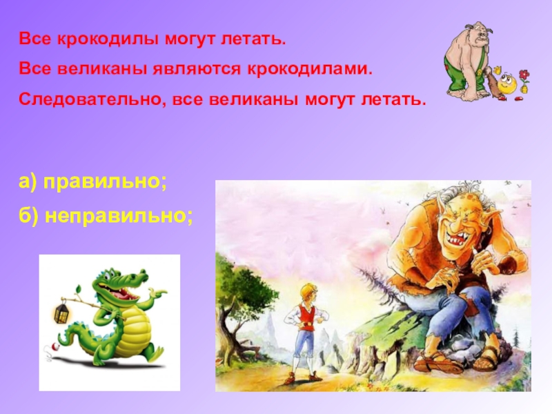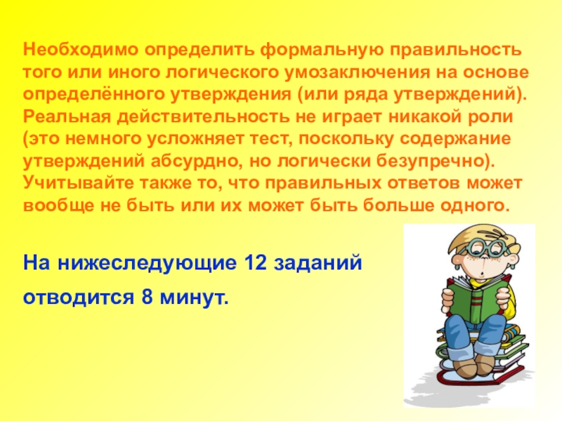 определённого утверждения (или ряда утверждений). Реальная действительность не играет никакой роли (это немного усложняет тест, поскольку содержание утверждений абсурдно, но логически безупречно). Учитывайте также то, что правильных ответов может вообще не быть или их может быть больше одного.