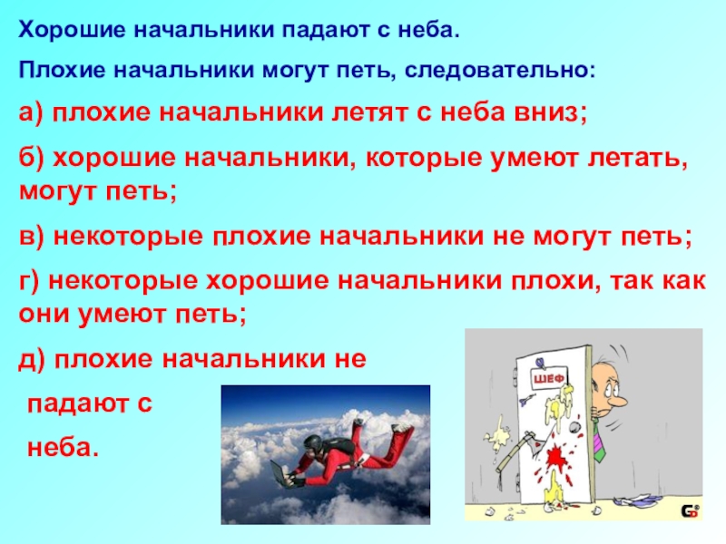 г) некоторые хорошие начальники плохи, так как они умеют петь;