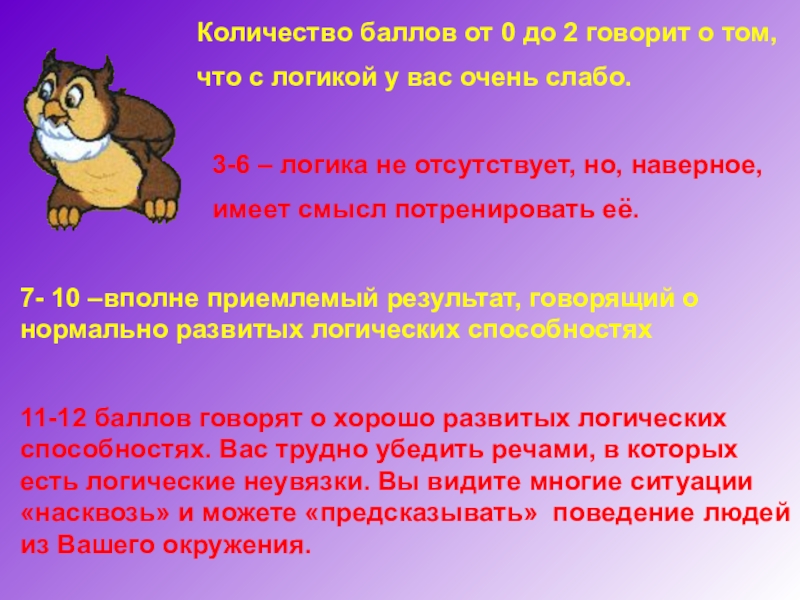 11-12 баллов говорят о хорошо развитых логических способностях. Вас трудно убедить речами, в которых есть логические неувязки. Вы видите многие ситуации «насквозь» и можете «предсказывать» поведение людей из Вашего окружения.