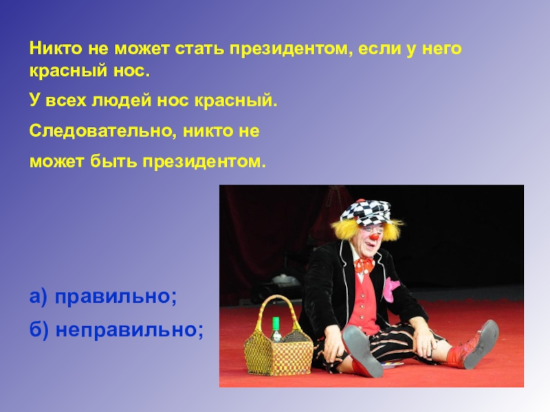 Слайд 7Никто не может стать президентом, если у него красный нос.