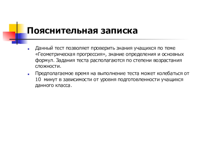 Пояснительная запискаДанный тест позволяет проверить знания учащихся по теме «Геометрическая прогрессия», знание определения и основных формул. Задания теста располагаются по степени возрастания сложности. Предполагаемое время на выполнение теста может колебаться от 10 минут в зависимости от