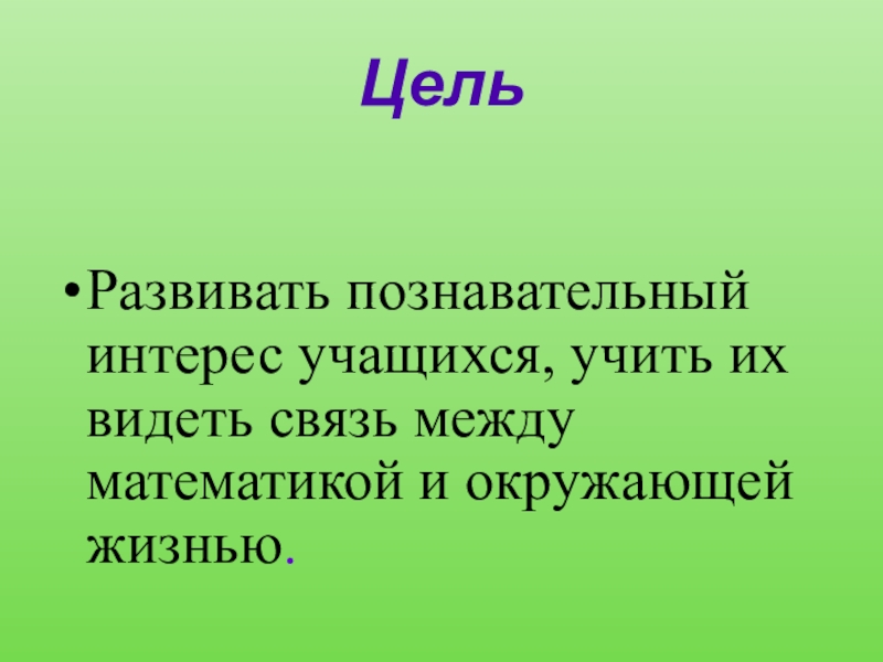 ЦельРазвивать познавательный интерес учащихся, учить их видеть связь между математикой и окружающей жизнью.