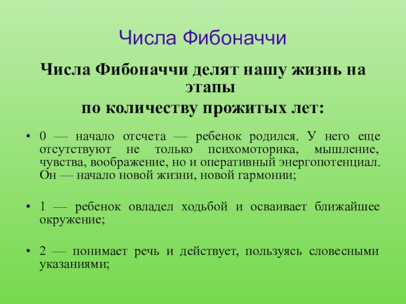 Числа ФибоначчиЧисла Фибоначчи делят нашу жизнь на этапы по количеству прожитых лет:0 — начало отсчета — ребенок
